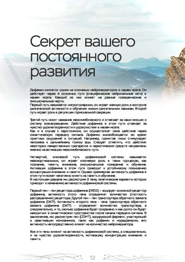 Этот ДНК анализ показывает влияние наиболее важных 10 генов на психическое и эмоциональное состояние. Именно они регулируют выработку гормонов, работу нейромедиаторов. Используйте знания о природных свойствах своего организма для борьбы со стрессом, повышения работоспособности и общего тонуса. Каждый человек индивидуален, поэтому мы рекомендуем пройти наш генетический нейро тест в Кирово-Чепецке.